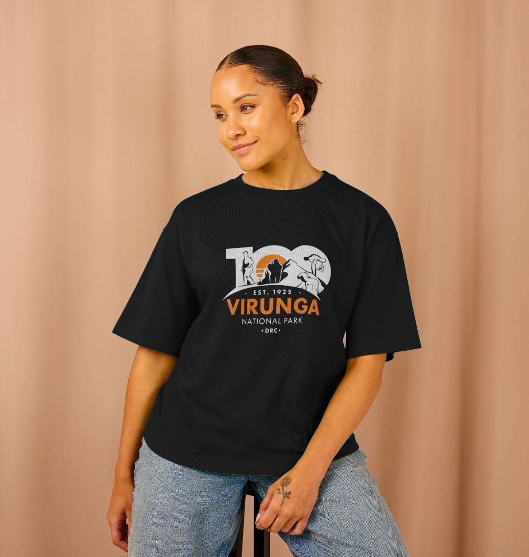 • A woman wearing a black Virunga 100 Women's Oversize T-shirt standing against a beige background.
