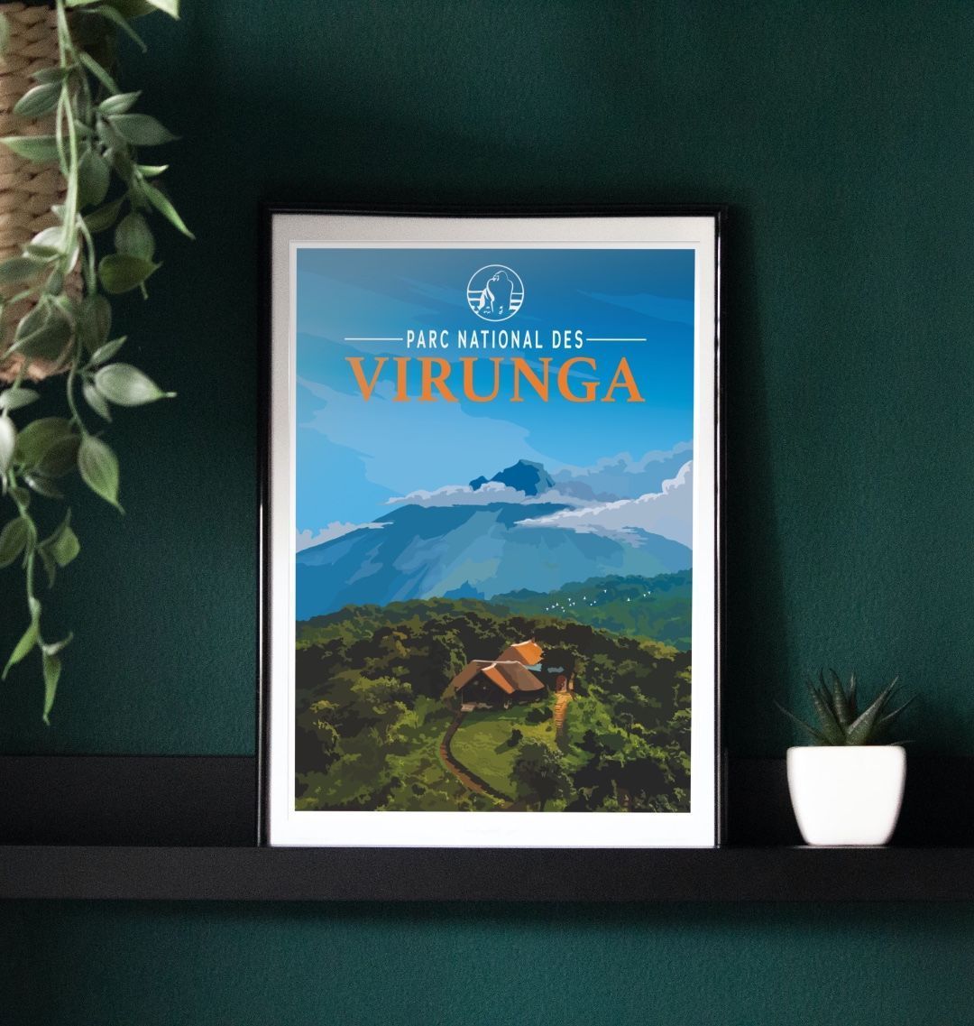Kibumba Tented Camp, located in Virunga’s gorilla sector, sits in the shadow of Mount Mikeno, the second-highest peak in the Virunga Massif. This illustrated poster depicts both these treasured elements of the Park in sublime harmony, the blue skies above perfect for clearing a foggy-head and manifesting positivity for the day ahead.