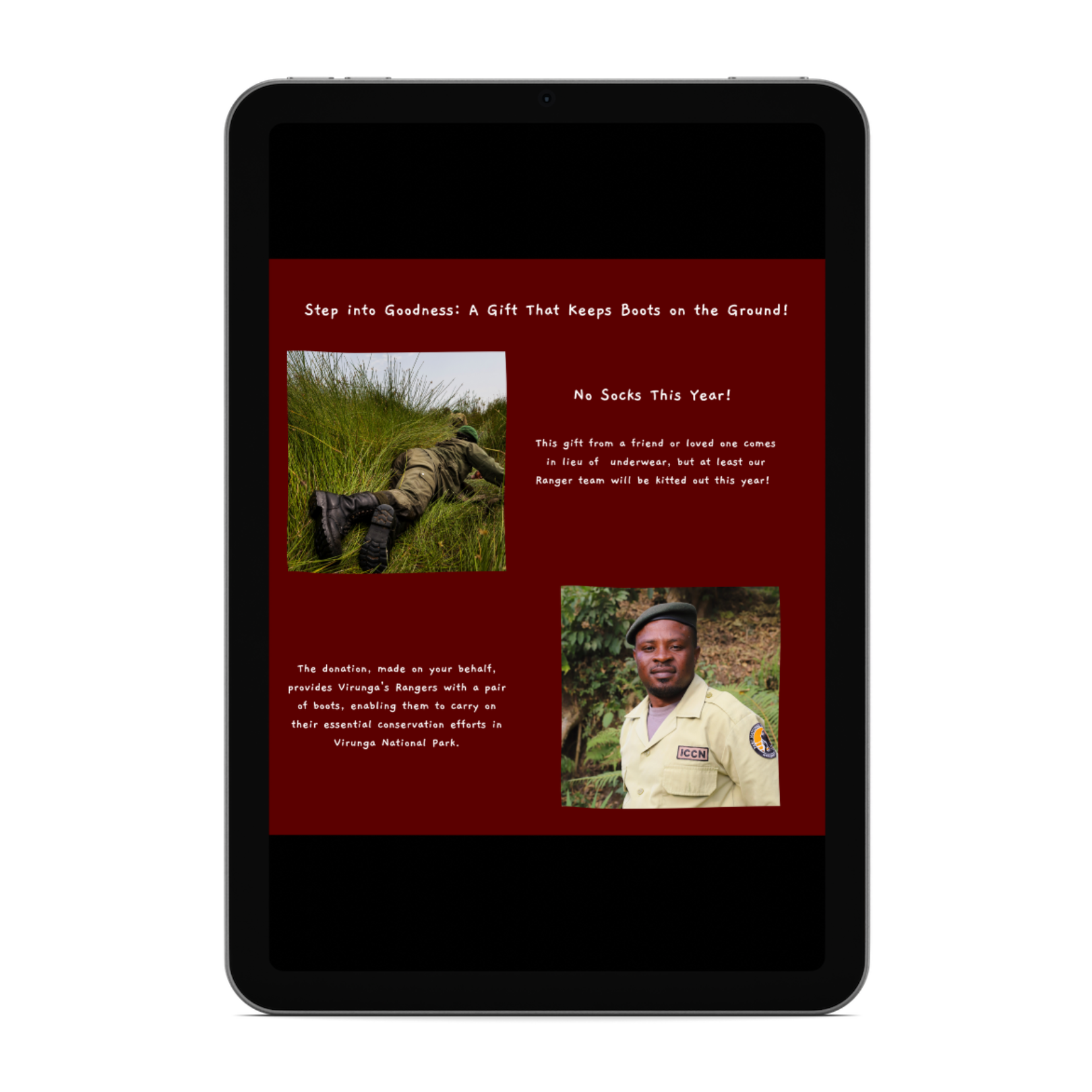 Créez un impact avec notre cadeau virtuel! Votre généreuse contribution fournit des bottes essentielles aux Rangers des Virunga, vitales au maintien de leurs efforts de conservation au sein du Parc National des Virunga.